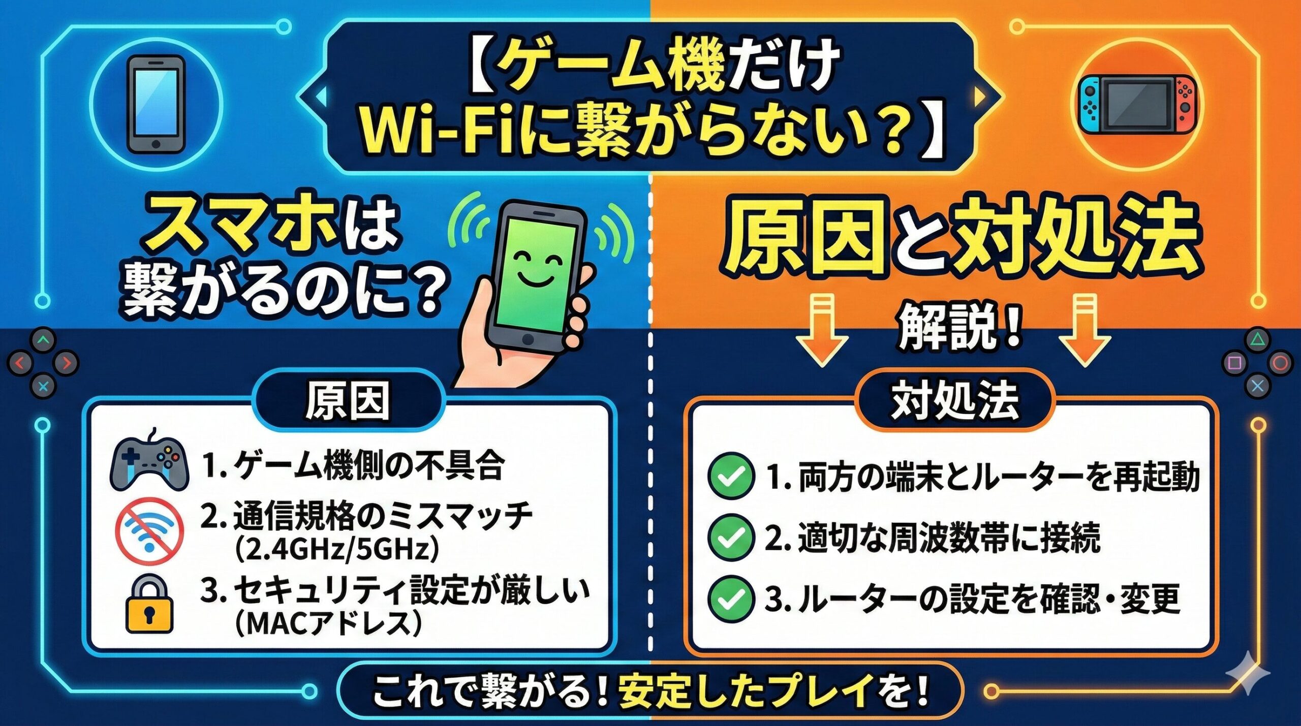 特に、スマホとゲーム機の通信方式の違いを理解することが、解決への第一歩となります。